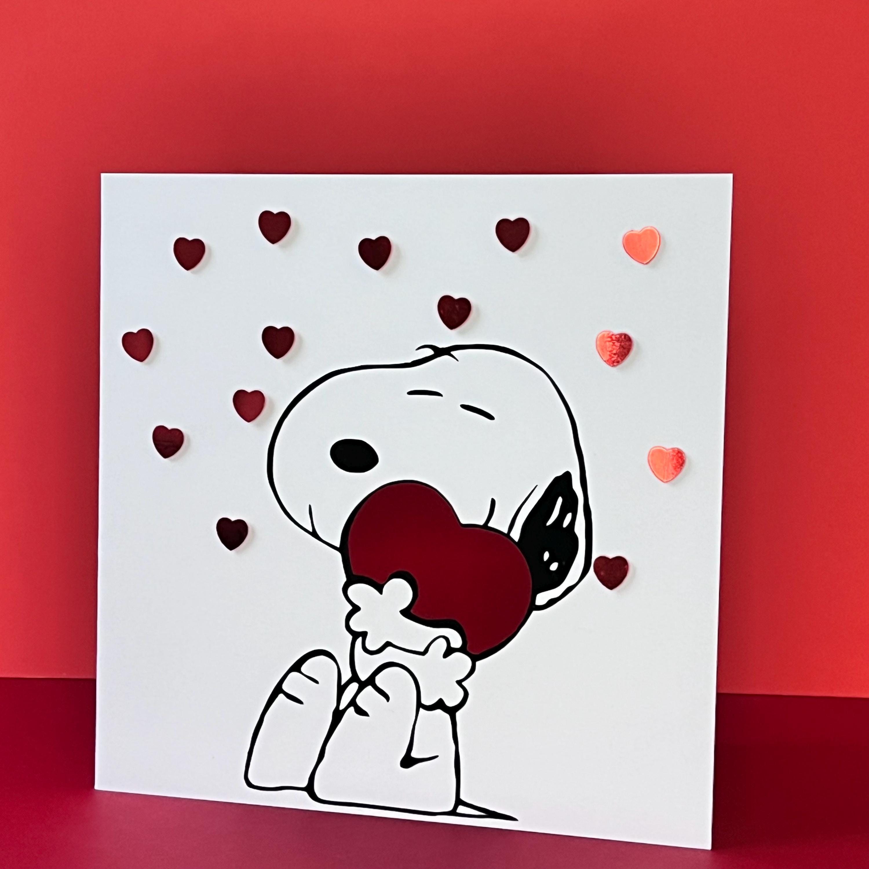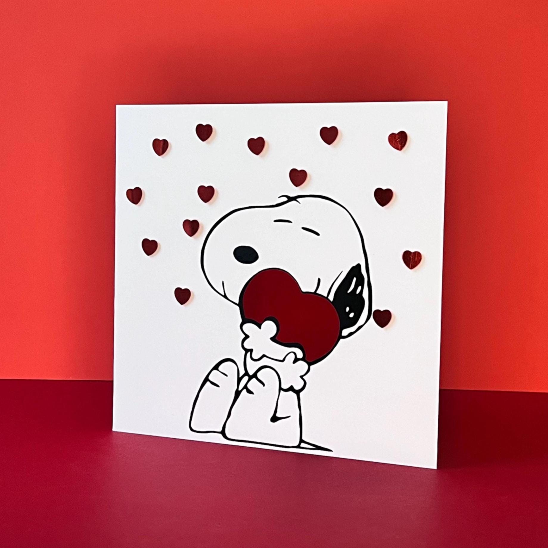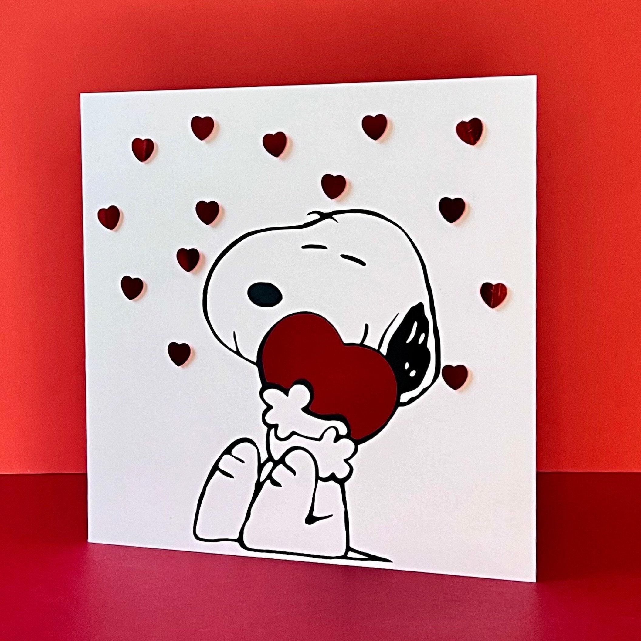 Celebrate love and nostalgia with this handmade greeting card inspired by the timeless charm of Snoopy. Crafted from luxury white card stock, each 6”x6” card features a detailed vinyl cut design that captures the retro spirit beautifully. Perfect for any occasion, this blank card invites your personal message, making it a unique keepsake.