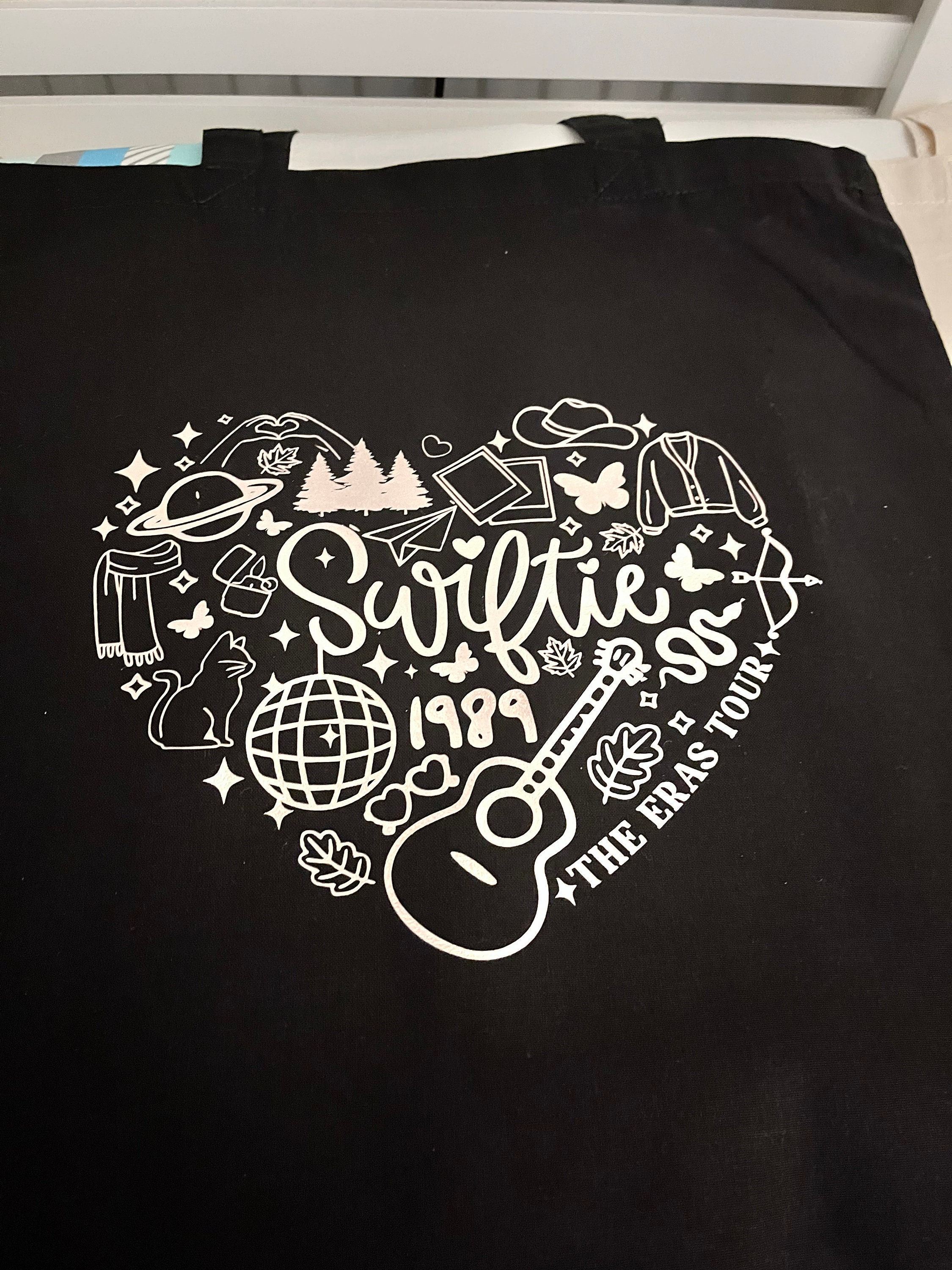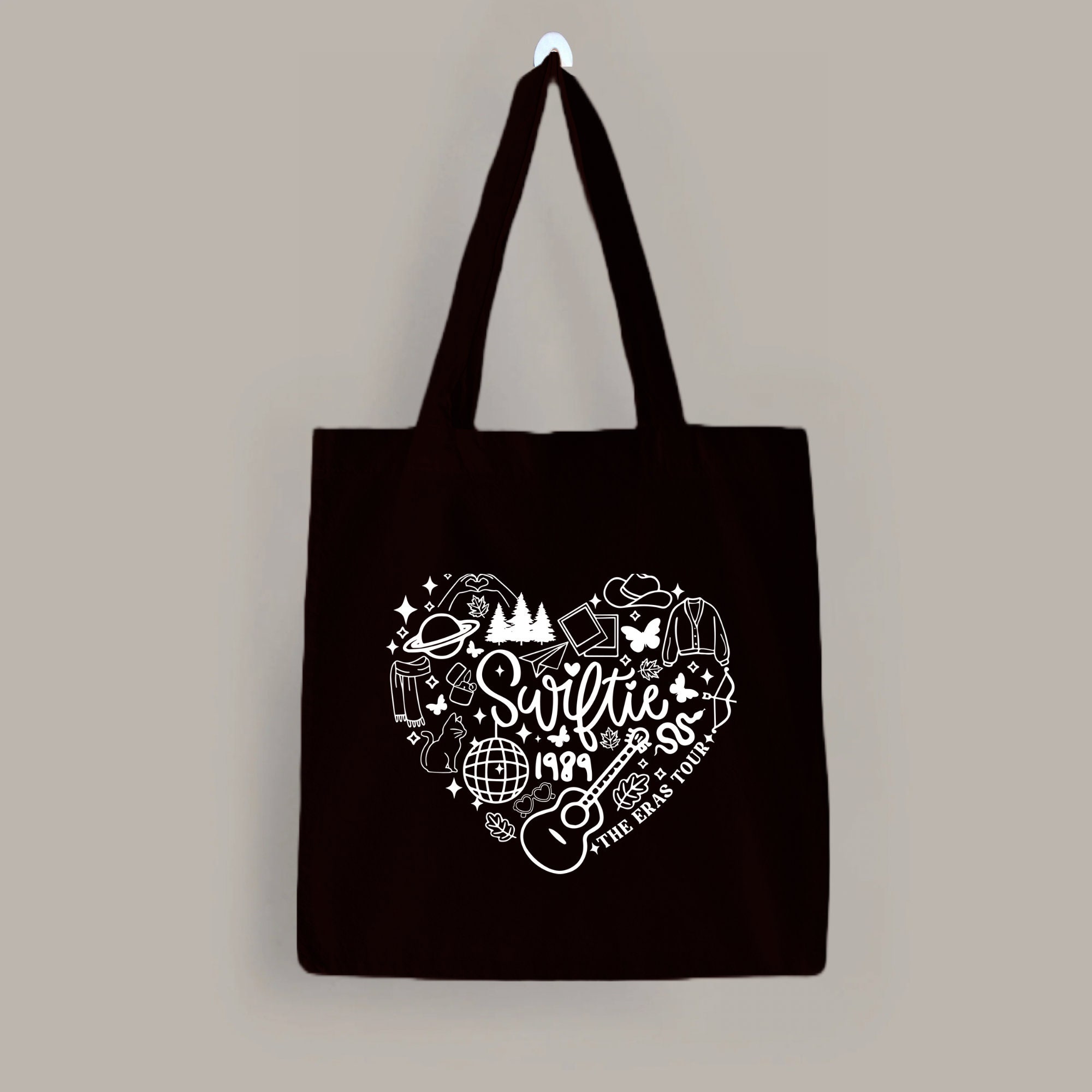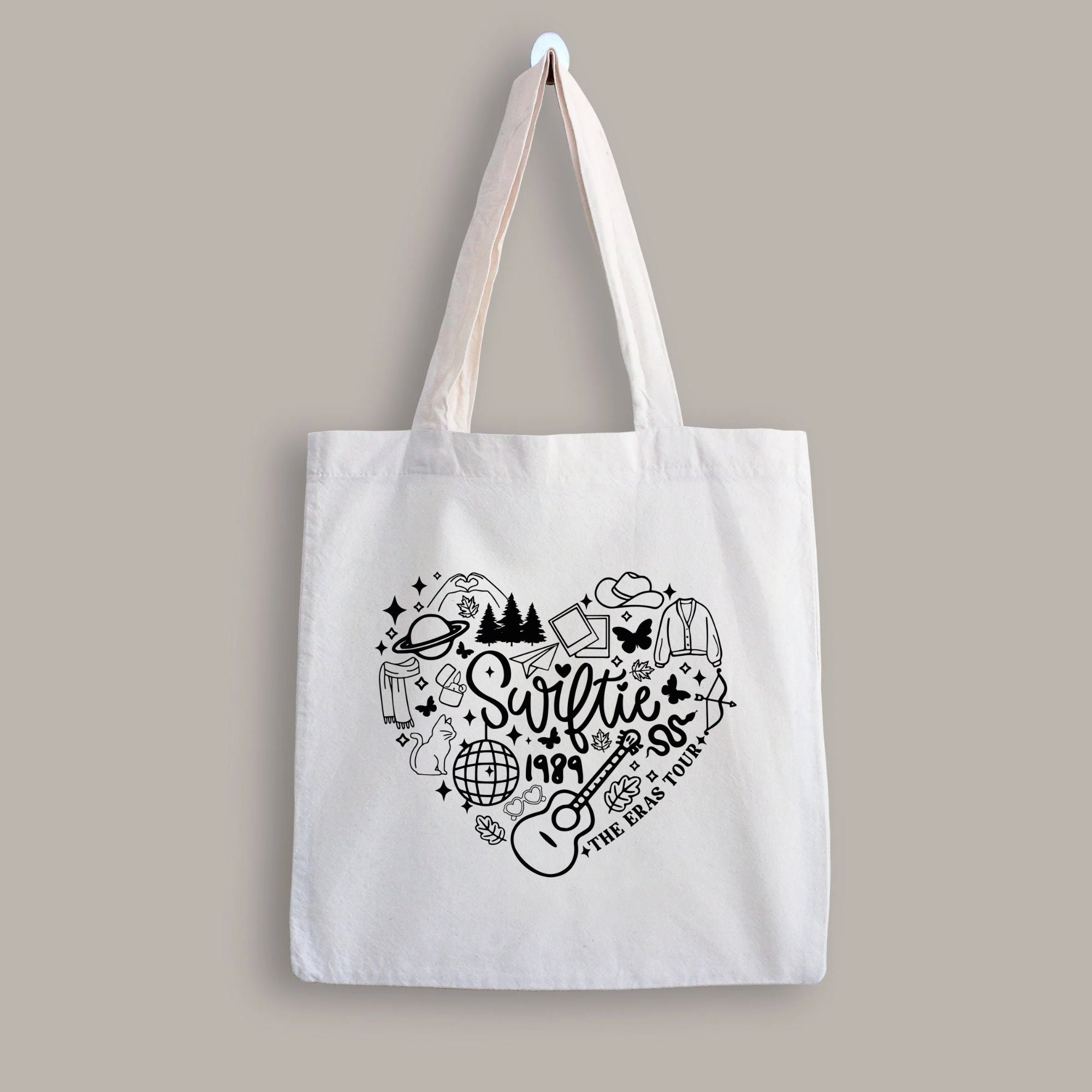 Celebrate your love for Taylor Swift with this beautifully crafted tote bag, inspired by the iconic eras of her music career. Designed for Swifties who want a stylish and practical accessory, this tote features a unique heart-shaped design made up of symbols representing Taylor's unforgettable albums. Whether you're heading to the Eras Tour 2024 or looking for the perfect Taylor Swift gift, this bag combines fandom with everyday functionality.