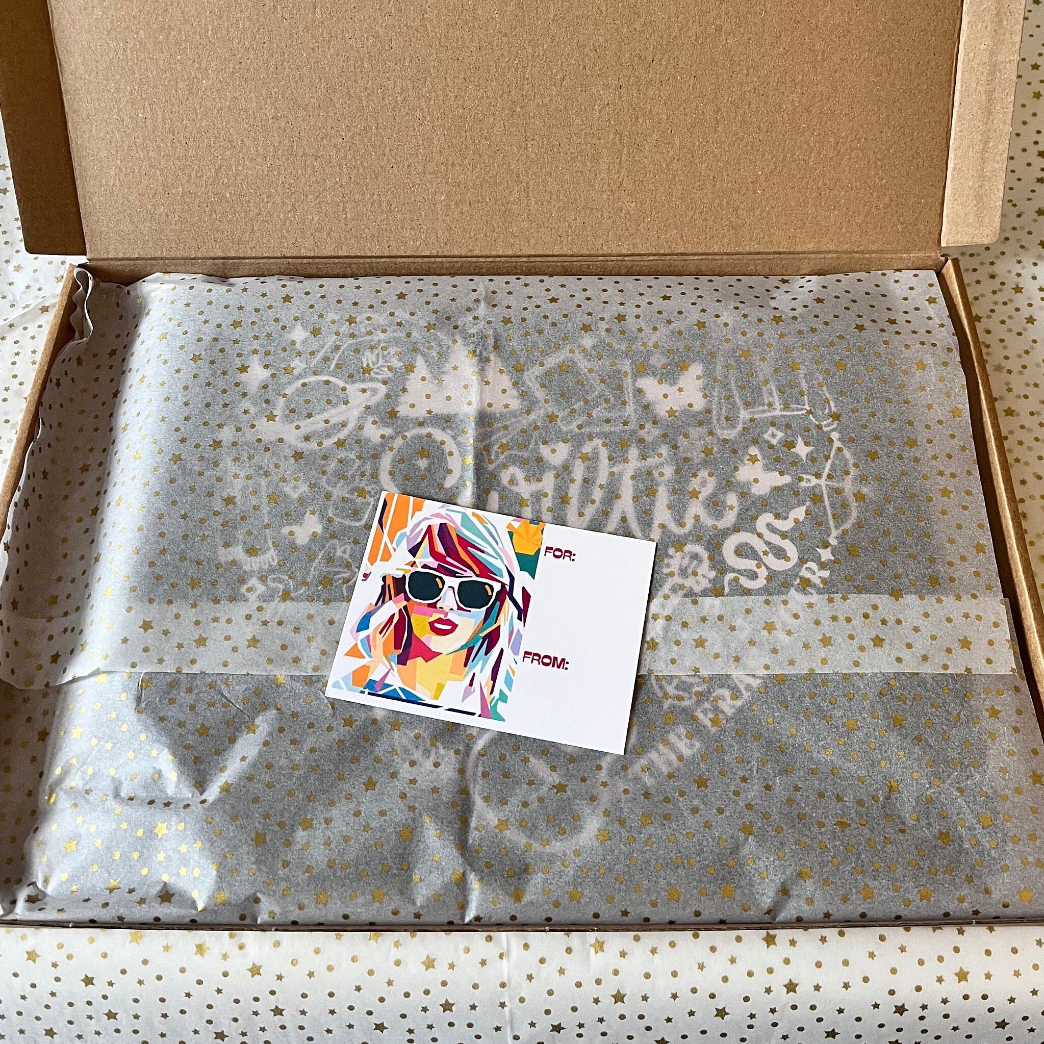 - Includes complimentary gift wrapping with reusable tissue paper, slimline cardboard box, care instructions, and a handmade Swiftie gift tag